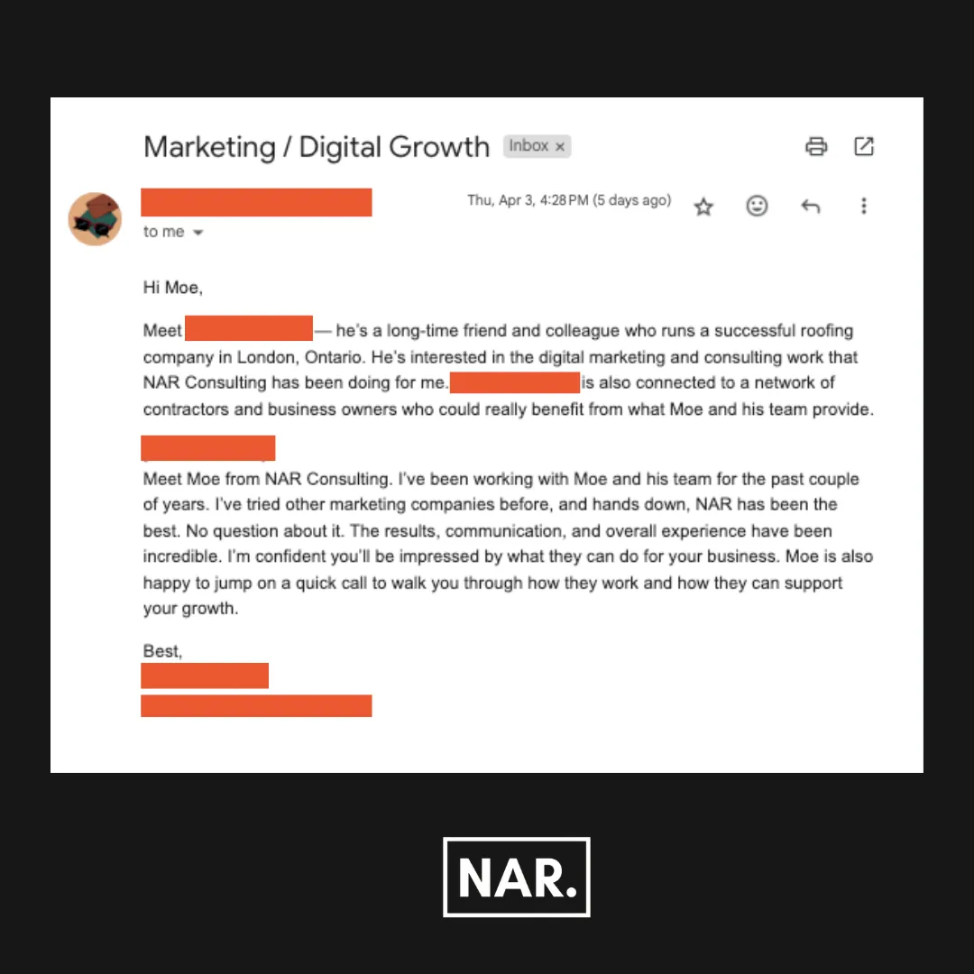 "I was skeptical after wasting money with another company, but NAR proved they customize everything to fit my business. The leads are qualified, the process saves me time, and I finally have consistency without stressing where the next job is coming from. It’s been a game changer for both my business and my family life."
