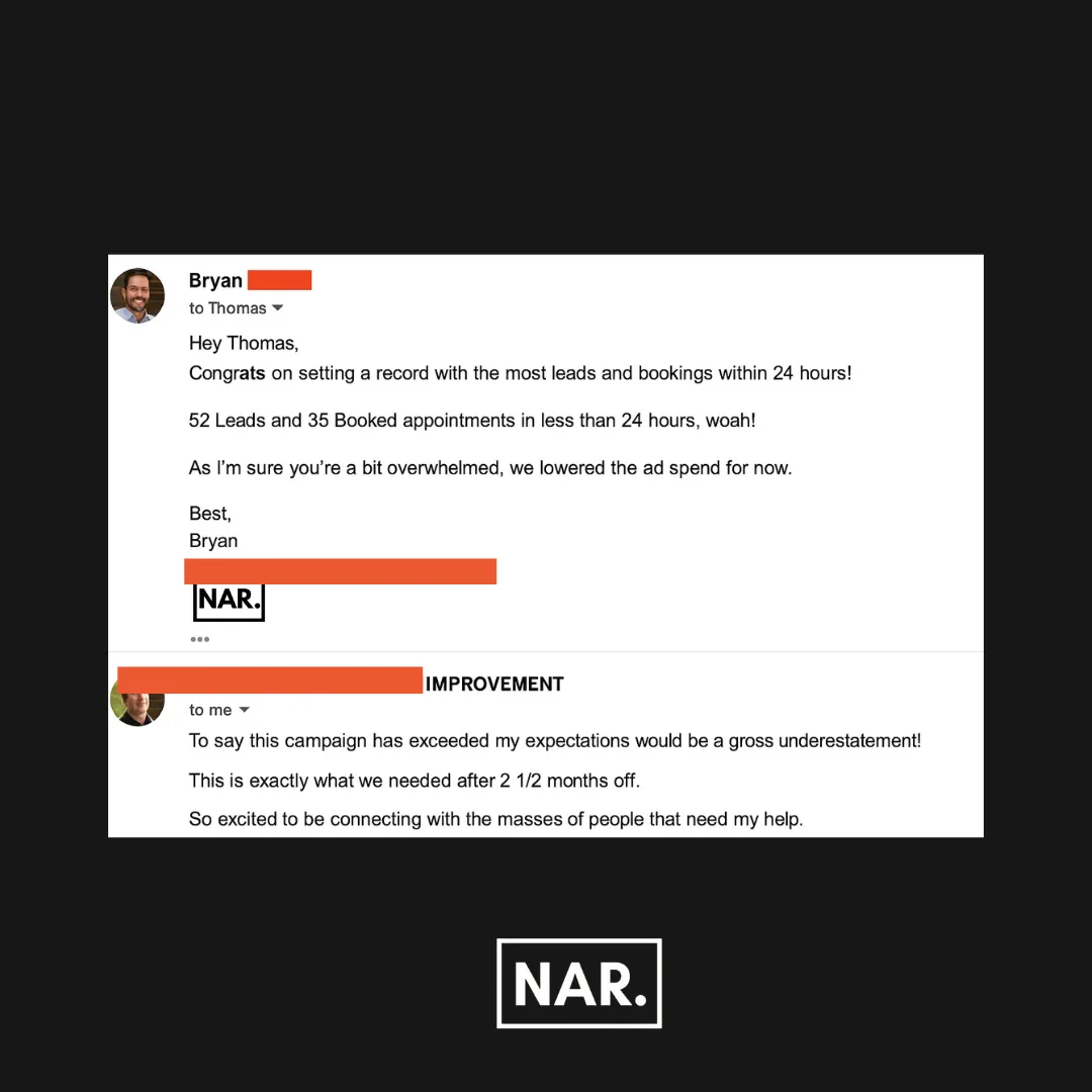 "We’re booked up for these two months at $147,000 — it’s not a joke. At first, I was overwhelmed with so many appointments I had to hire extra people to keep up. NAR did such a good job for me that I recommend them to anyone looking for real results."